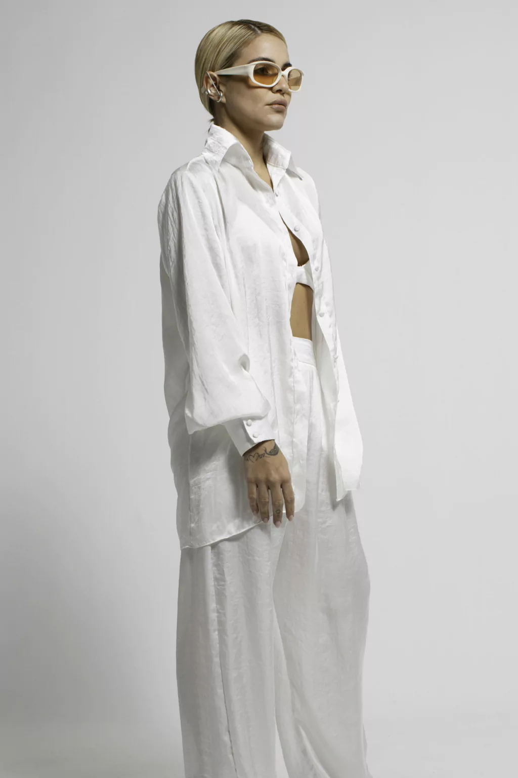 Calça pantalona de cintura alta feita em tecido leve e fluído.