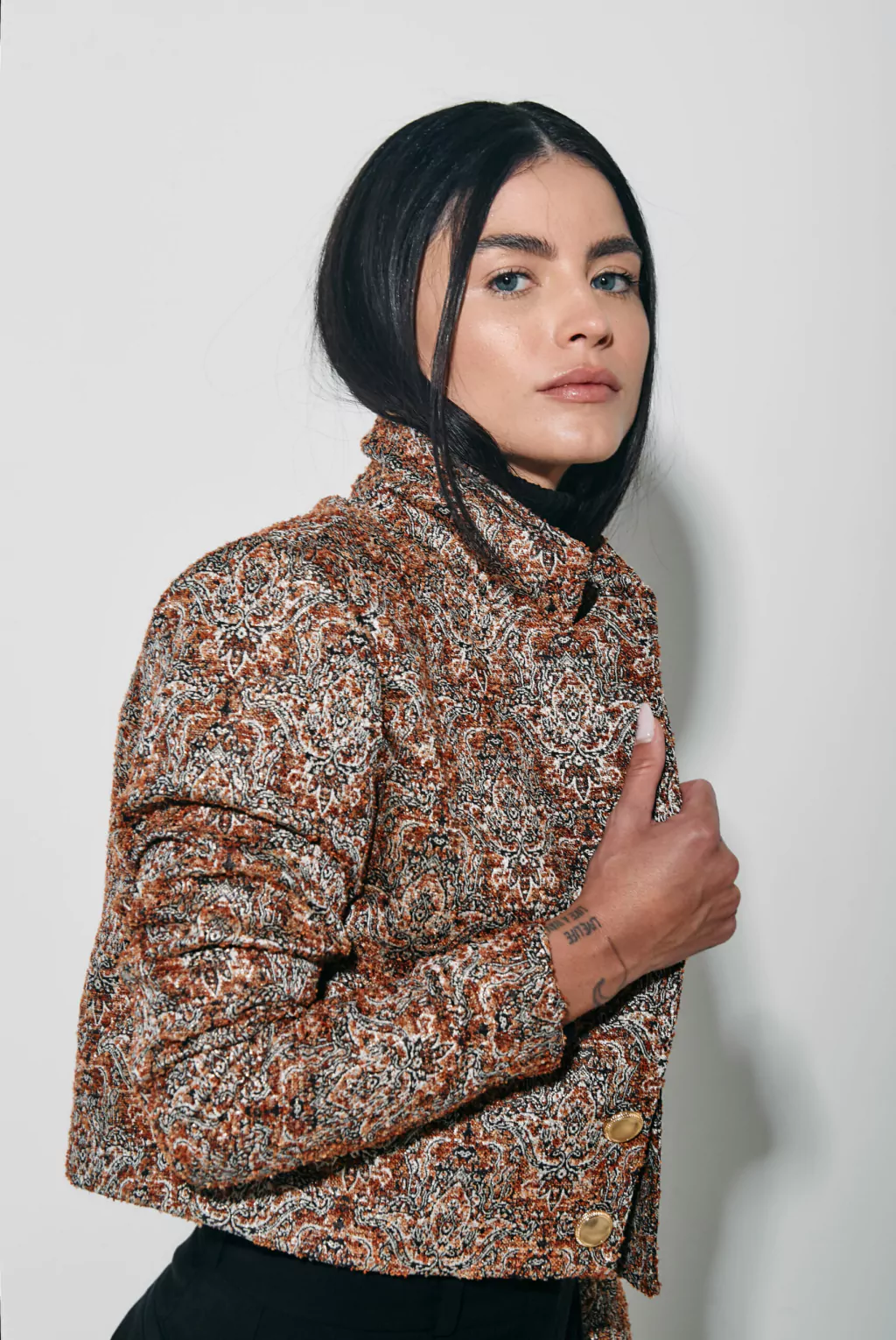 Casaqueto de alfaiataria feito em Jacquard com padronagem de fios metálicos.